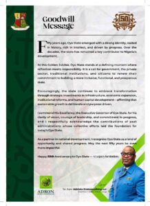 The Chairman and Chief Executive Officer of Adron Homes and Properties Limited, Aare Adetola Emmanuelking, has congratulated the Government and people of Oyo State as the state marks its 50th anniversary, describing the occasion as a celebration of resilience, cultural pride, and sustained progress.